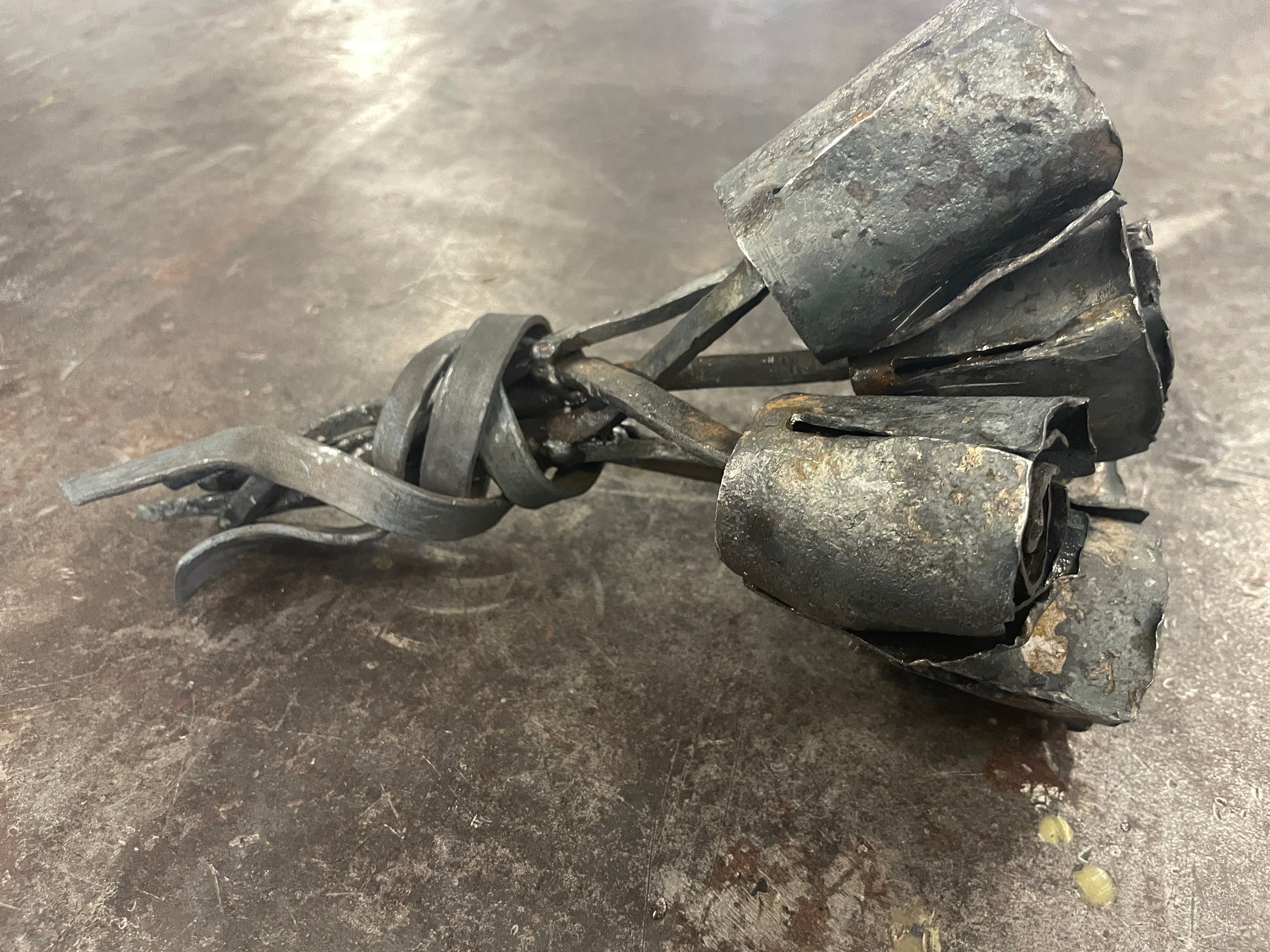 Each "Russian style" rose is a single piece, hand forged and wrapped from a plasma cut blank, and comes out totally unique. Approximately life size (around 2x2" for the bloom and an additional 8-9" for the stem).